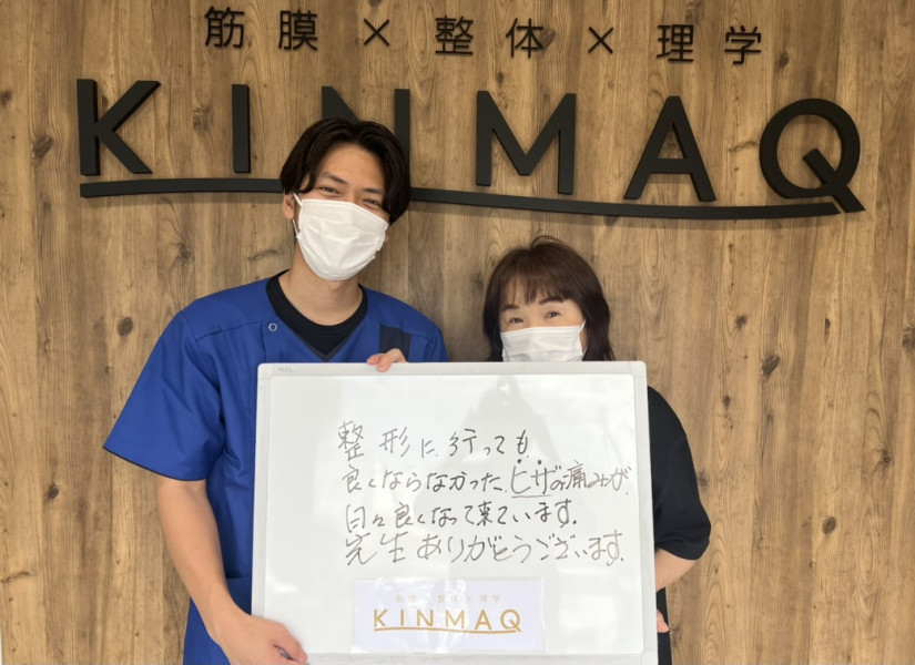 膝関節の痛みが突然出てきて、整形外科を受診しましたが、膝の注射と痛み止めの処方のみで痛みがよくなりませんでした。痛みを良くしていきたいと整体を探していると、KINMAQ整体院を見つけました。筋膜の施術を受け始めてからは徐々に痛みが良くなり、現在は痛みが全然気にならなくなりました! ※個人の感想です。効果には個人差があります。 |