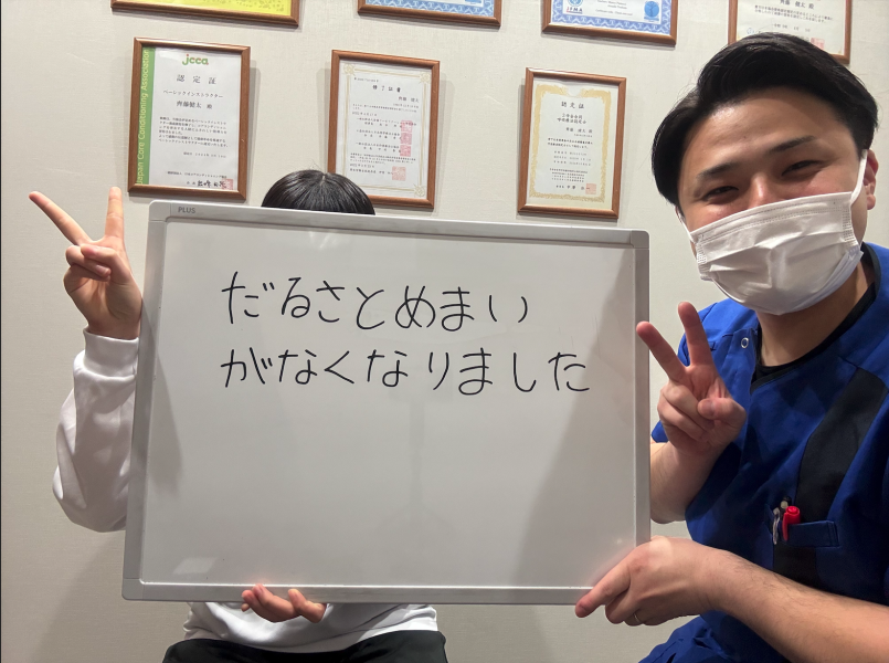 「だるさとめまいが消えました!」 学校の部活に行くのも大変で、普段から疲労感が強くあってひどいとめまいまで症状を感じていました。病院に行きましたが薬だけ飲んでも変わらずお母さんにここの整体に連れてきてもらいました。治療をしてから2.3回目から疲れとめまいの症状はなくなって部活にも行けるようになりました。普段の姿勢と昔の怪我が原因と担当の先生に言われてびっくりしました。治って本当に良かったです。先生ありがとう! ※個人の感想です。効果には個人差があります。 |