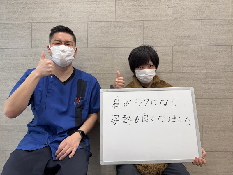 「肩が上がるようになって、頭痛が軽減しました!」 肩の痛みは無くなり長年悩まされていた頭痛も軽減されました! 初めて来たときは肩の痛みがすごく、だんだん肩が上がらなくなるような状態でした。 今までは肩が痛く仕事が出来なくなることはなかったのですが、ひどくなり仕事に集中できず、週に何回も頭が痛くなって身体がしんどく、どうにかしてほしいと思っていました。 施術はもちろん、話しやすく親しみやすい雰囲気で、来てよかったと思っています! ※個人の感想です。効果には個人差があります。 |