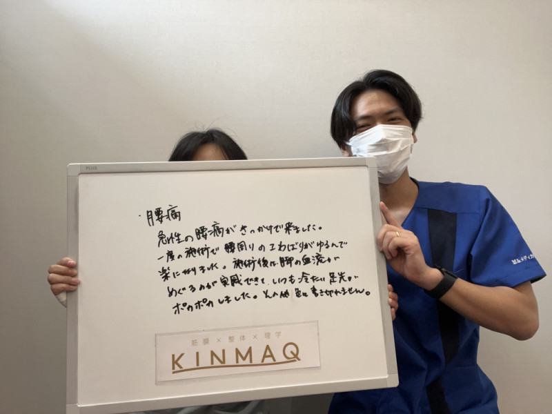 腰痛も首の痛みも改善しました! 腰を含めてあちこち痛いところだらけで、質問票では書ききれない程でした。自己流でのストレッチやマッサージを行っていましたが、良くはなりませんでした。筋膜については 正直全然知りませんでしたが、ここなら良くなるかもと思いKINMAQ整体院を訪れました。 施術を受けてみて、腰痛及び首の痛みが大分良くなってきているのを実感しました。また、先生の説明がとても分かりやすく、施術を受けるごとに筋膜がとても大切なものだと思うようになりました。 出来れば保険適用となってほしいくらいです。 ※個人の感想です。効果には個人差があります。 |